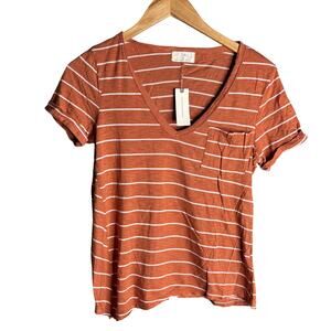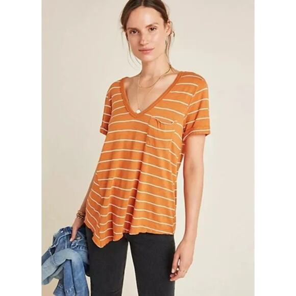 Anthropologie T.La Riley Asymmetrical Pocket Tee in Gold Orange. Size S / Small. Features deep V-neck, short sleeves, chest patch pocket, striped print, and intentionally asymmetric. 44% Cotton, 44% Modal, 12% Polyester. NWT / New with tags.
