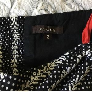 Tocca halter top , keyhole slit in the front, side zipper closure, excellent condition. Dark indigo/Black? With contrasting red and white embroidery. Tie halter neck.