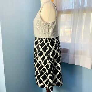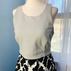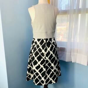 A fit-and-flare beauty with a cute polka-dot bodice that has an asymmetric seam and a simple bias patterned skirt. The fabric is lightweight which makes it easy to throw a cardigan or jacket/blazer over and the skirt floats away from the body for a flattering look. Hidden side zipper. In excellent used condition