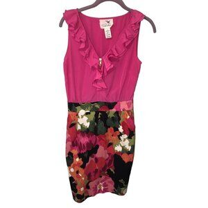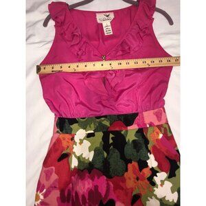 Anthropologie Tabitha Great Escape Dress Size 4 Ruffles Pink Pockets Floral Mixed Media Sleeveless Knee Length Feminine Romantic Girly Party Wedding Career Office