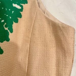Rounded Neckline ~ Sleeveless ~ Single Large Inverted Pleat on the Front of the Neckline ~ Concealed Zipper down the Back ~ Fully Lined ~ Fitted Silhouette ~ Creamy Tan… with a Large Pom Flower Print in Brown, Green, Mustard & Black