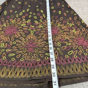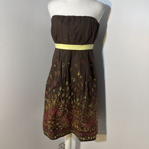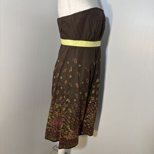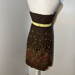 This Anthropologie Tabitha strapless dress is a perfect blend of whimsy and elegance. Crafted in a rich chocolate brown cotton with an eyelet floral burst design in shades of green, pink, and gold. Features a flattering strapless bodice, fitted waist with chartreuse grosgrain ribbon detail, and a lightly pleated skirt that hits around the knee.