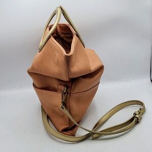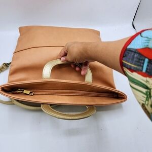 This Anthropologie Tabitha bag is a versatile piece that can be used as a clutch, tote, crossbody or shoulder bag. It features a smooth Blush and gold exterior made of polyurethane fabric that is water and stain-resistant. The bag has a zipper closure and is lined with tan fabric, offering ample storage with inner and outer pockets.