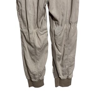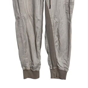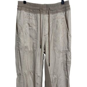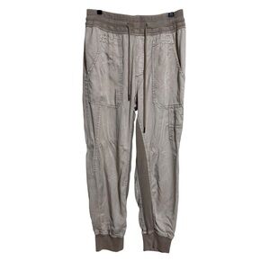 These Anthropologie cargo pants in a versatile tan color offer a relaxed fit, perfect for casual outings or lounging. The design features a comfortable drawstring waistband and elastic cuffs, making them a stylish and practical choice for everyday wear.