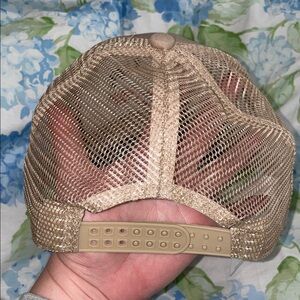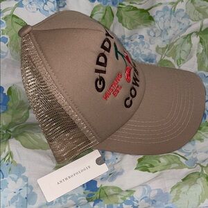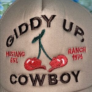 Stylish tan cowboy hat with embroidered cherries. Features 'Giddy Up Cowboy' text. Perfect for casual wear.