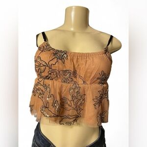 Chic tan crop top with elegant black embroidery. Ideal for casual outings.