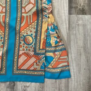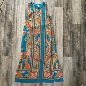 Elevate your wardrobe with this stunning Anthropologie column dress by Akemi + Kin. The dress boasts a cowl neckline and a sleeveless design, perfect for a casual occasion. The dress features a beautiful orange motif in a geometric pattern, adding a pop of color to your look.