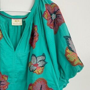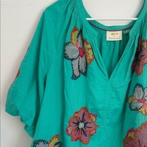 Anthropologie Teal Blouse with Multicolor Floral Embroidery