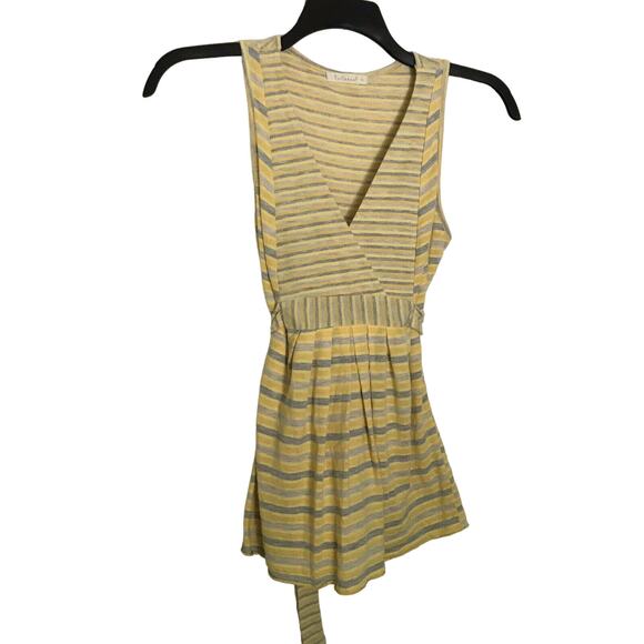 Women’s babydoll top by Testament for Anthropologie. This yellow striped top has a faux wrap v-neck and a tie around the waist. It is a cotton blend.