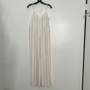 Anthropologie The Essential Striped Jumpsuit in an ivory white & orange coloring ft. a striped pattern detail, tank adjustable straps, v-neckline, lined, 2 bum pockets and 2 hip pockets, and an invisible back zipper.