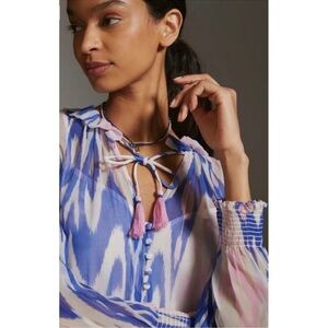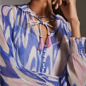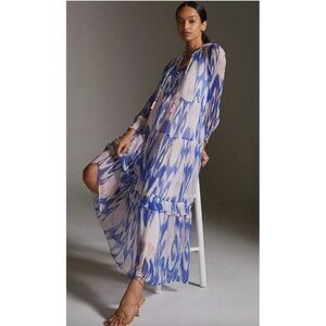Anthropologie The Marais Printed Chiffon Maxi Dress Long Sleeve White Blue Pink