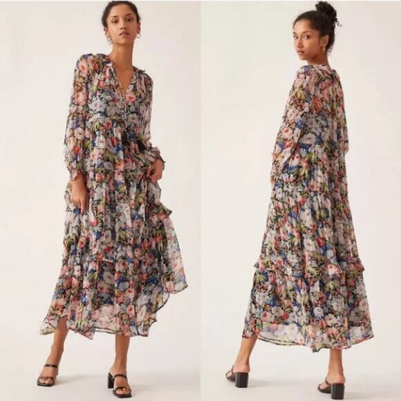 The Anthropologie Marais Printed Chiffon Maxi Dress in size L features a beautiful floral pattern in a sheer chiffon overlay, making it perfect for various occasions such as weddings, parties, or even formal events. With a V-neckline and long sleeves, this dress exudes a feminine and elegant style that can be worn year-round. Made from 100% cupro, the dress is of high quality and has a vibrant multicolor print that adds a touch of spring to your wardrobe.