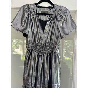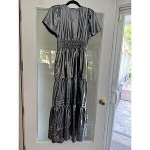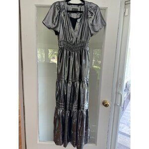 Anthropologie The Somerset Maxi Tiered Dress Metallic Shine Silver Grey Size XS