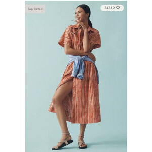Anthropologie The Tobie Button-Front Pleated Shirt Dress by Exquise New without tags Brand tag marked to prevent store returns Size: XXS Petite Color: orange striped Tailored to perfection, the Tobie Shirt Dress is on top of everyone’s mind – with its classic collar, exaggerated sleeves, and waist-defining pleats. Cotton, polyester, elastane Side seam pockets Shirt collar Pleats at waist Exaggerated sleeves Button front Dry clean Imported /1
