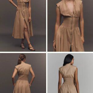 Beautiful dress by Anthropologie! It features a smocked waist, zippered front and very lightly padded shoulders. NWT