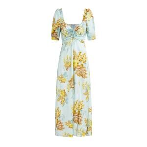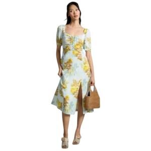 Anthropologie x Favorite Daughter The Vineyard Floral Satin Puff Sleeve Midi A-Line Blue Yellow Puff Sleeve Dress with Slit size 4, NWT