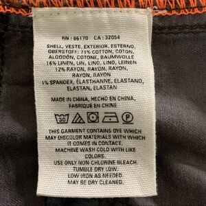 Relaxed fit Removable belt Side slant and back patch pockets Front zip Machine wash