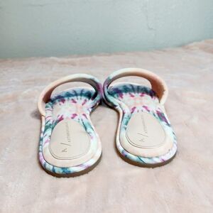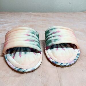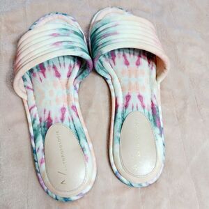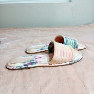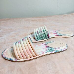 Step into a world of comfort and style with these Anthropologie sandals, featuring a chic open-toe design and a playful pink and blue color palette. Puff horizontal strap design offer a secure fit, while the flat sole ensures all-day comfort. Perfect for casual outings. Pre-owned in great condition. Please refer to pictures for best description and condition verification.