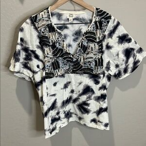 Anthropologie Tiny Blouse Black White Tie-Dye Shirt Large Sequin Embroidery Top
