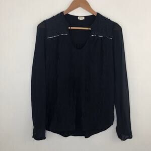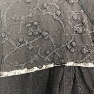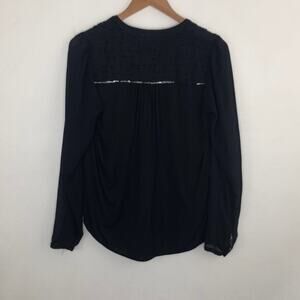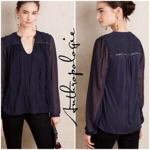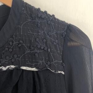 In good previously owned condition. Missing some silver in a few spots. Anthropologie Tiny navy blue embroidered split neck top with sheer sleeves, rounded high low waist, v-neck, and tie at front neck. Body is lined, oversized, with design detail embroidery and silver accents. Body is 100% polyester, contest is 47% modal, 47% tencil, and 6% spandex.
