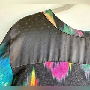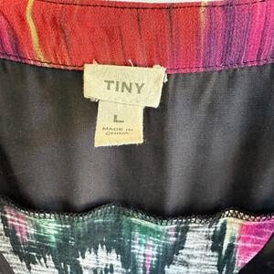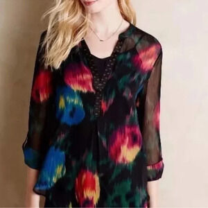 Anthropologie Tiny Tulipano Black Watercolor Blouse in great condition- gently worn with no flaws. Patterned but sheer front and patterned jersey back. Sleeves have cuff loops. Pullover style.