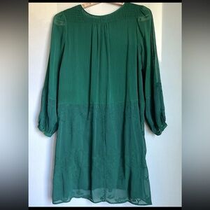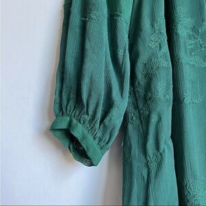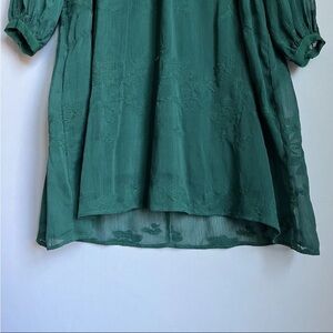 A few loose threads. Smoke free. Beautiful green dress! Delight in the bohemian charm of this Anthropologie Tiny Women's Dress in size XS. The dress boasts an elegant V-neckline and a playful, short length, perfect for a variety of occasions. Adorned with intricate embroidery, it captures a quaint peasant aesthetic that's in sync with the latest fashion trends.