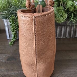 Chic and versatile Anthropologie mini handbag in a rich tobacco color. Features a stylish textured design on the front and back, rolled top handles, and an adjustable/removable crossbody strap for multiple ways to wear. Perfect for everyday use or a night out!