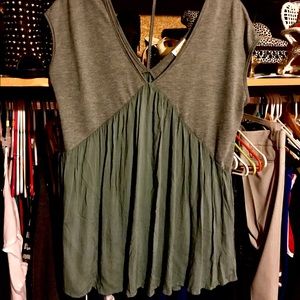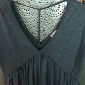 Super cute, very lightweight, with a swingy body and an oversized fit, but the Tback is what makes this shirt so cute! This Top has only been tried on by me, never even worn out, so it is basically brand new, no flaws but no tags, I threw them away. The measurements are 22" unstretched for chest and 29" for length! First picture is a stock photo but the rest are actual photos. I just have way tooooo many Anthro Tops at this point.... actual color is like pics #2,3,4, a sage green.