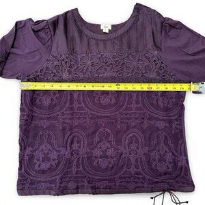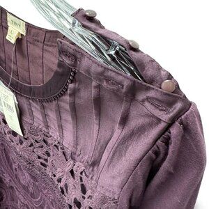 Luxurious eggplant color top. NWT! Bodice is fully lined while sleeves allow some skin to show through at the lace part of the sleeve. The lace on the sleeve is soft on the inside and not scratchy at all. So many lovely details: pleats, lace, buttons along one shoulder. Silky feel on top and lace and cotton on bottom. No large pattern lace on the back of the top. Band around cuff of sleeves. There’s a functional little drawstring along the bottom edge. Please see photos for measurements. Hand wash or dry clean.
