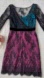 Body is a sheer black lace overlay with a silk underdress. Underdress is cerulean luminous blue on the bodice and magenta on the skirt. Black velvet ribbon at waistline. 3/4 length sleeves. Draped flounce at neckline. V back. Hits around the knee.