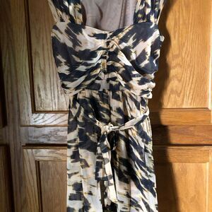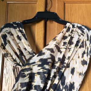 Features: V-neck, soft lightweight brown/tan & black leopard print silk fabric, balloon style hem, ruched accents, cap sleeves, side zip closure, tie back, fully lined