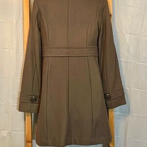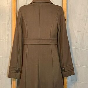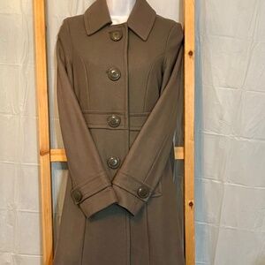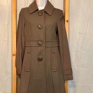 Classic peacoat silhouette. Features four large round buttons running down the front center, two rectangular flap pockets on the front, front sleeve button strap, colorful lining and a distinct fit-and-flare shape.