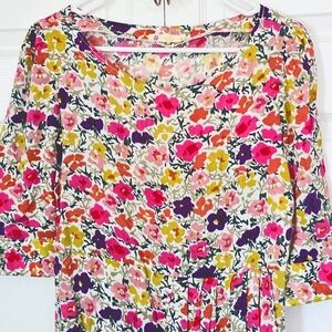 Vibrant and beautiful spring floral dress with faux wrap skirt. Round neck and short sleeves. Hidden side zipper. Very lightweight. Not lined.