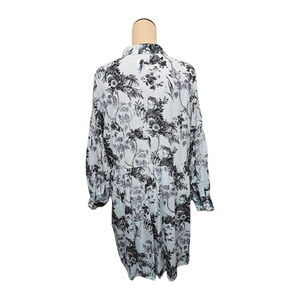Beautiful blue background with black and gray floral print and embroidered floral detailing on the chest