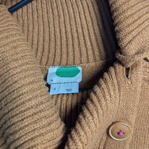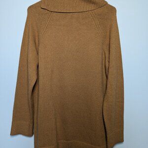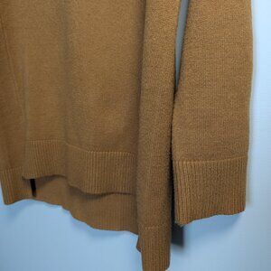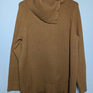 The Anthropologie Turtleneck style button details sweater in size small is a stylish and versatile piece perfect for the winter and fall seasons. Made from a cozy knit fabric, this solid brown sweater features a turtleneck neckline and long sleeves, with button accents adding a touch of detail. The relaxed fit and pullover style make it easy to throw on for casual occasions, while the cream exterior color adds a chic touch to any outfit. Perfect for the modern woman looking for a fashionable and comfortable sweater option. This sweater is long and has an oversized fit.