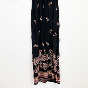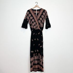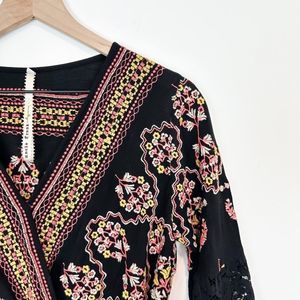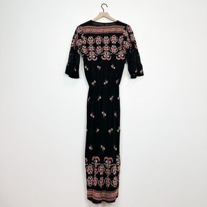 Peep this PERFECT bohemian dream dress from Anthropologie! This maxi dress is a stunning testament to the boho flower child! The soft black bodice is covered in bright, colorful embroidery. Neon coral pink, yellow, and white threading dance around to create delightful florals and Aztec/western inspired details. The 3/4 sleeves feature a flared opening and a lace panel. Cinched elastic waist. Crossover v neck with snap button closure. Side slit.