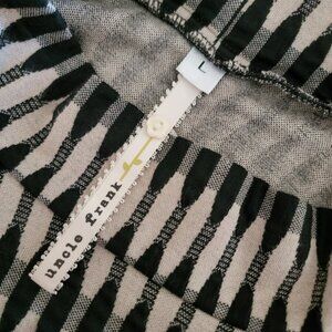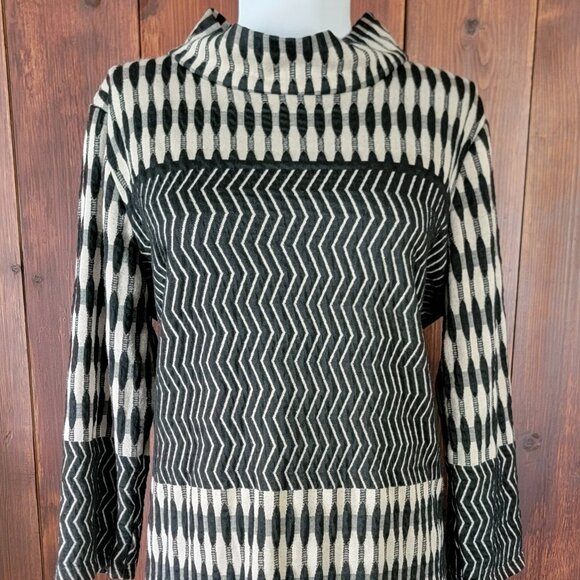 This Anthropologie Uncle Frank dress is a bold and flattering mod-inspired shift in black and tan with a mix of chevron and vertical oval patterns. The 2-inch circular stand collar and 3/4 sleeves give it a unique retro feel while the soft stretch viscose blend ensures a comfortable, flexible fit.