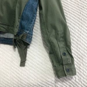 This is a great jean jacket with the cutest details. I would keep it, but I'm trying to downsize and I need another denim jacket like I need a hole in the head. This one has chore meets utility coat vibes with feminine ties in the back for good measure. You can wear the sleeves normally or roll them up and secure with a button strap. Measurements are as follows. chest: 18", length: 22.5"