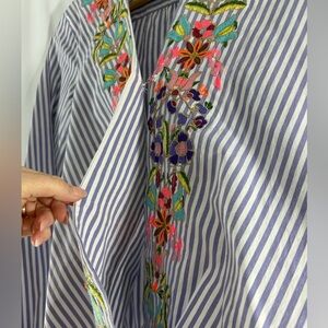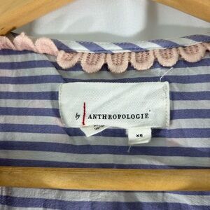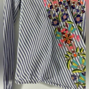 Anthropologie V Neck Wrap Look Long Sleeve Blouse XS Beautiful Embroidery Purple and White Stripe Clasp as Shown Smoke Free Home