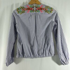 Anthropologie V Neck Wrap Look Long Sleeve Blouse XS Beautiful Embroidery Purple and White Stripe Clasp as Shown Smoke Free Home