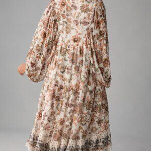 Flowy long sleeve maxi dress with criss cross front, balloon sleeves, and mixed prints. Gently used, from a smoke free home. No rips, tears, stains, smells, or runs.