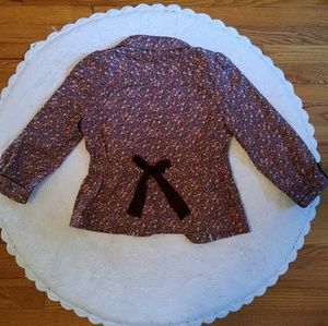 Fun, floral equestrian style blazer. Light-weight and very versatile. Adjustable cinching via an elegant ribbon detailing in the center back. The buttons are expensive looking, and the contrast print of the lining is a nice touch.