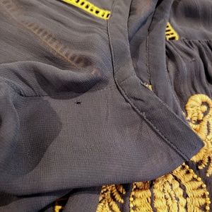 Beautiful sheer, embroidered peplum blouse. Due to the nature of the fabric, there are multiple pulls, a handful of missing beads and some messy embroidery that are scattered throughout the top. Small hole located on right shoulder. Most of the flaws are not super noticeable, but please zoom in on photos to really look over the top before purchase. Despite them, the top is still a stunner, very unique and is sure to turn heads. Priced accordingly, but offers are still welcome.