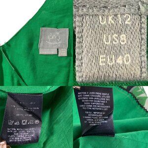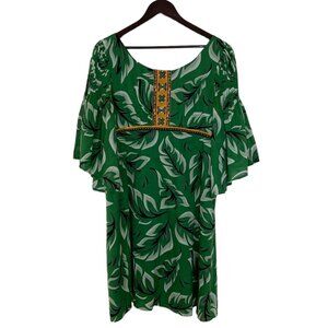 This Anthropologie Vanessa Virginia women's Musa Dress makes a statement due to it's 3/4 sleeves, flare cuffs, mini hem, embroidered trim, scoop neck, side zipper, lining, V cut back, pleated shoulders and green palm design.