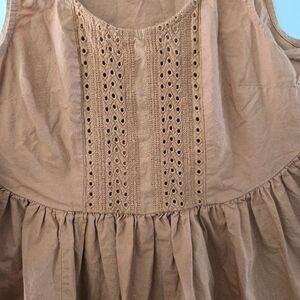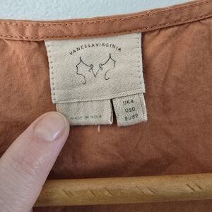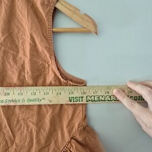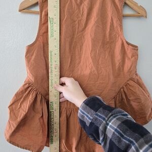 This Anthropologie Vanessa Virginia top in size 0 features a round neckline, pullover closure, and a sleeveless design with a casual sleeve type. The orange sienna color and bohemian theme are complemented by a ruffle accent and peplum style. Made of lightweight, breathable cotton knit fabric, this basic top is suitable for travel, parties, or casual wear in all seasons.