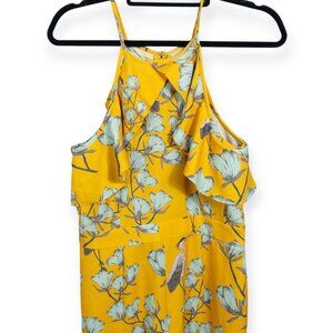 Anthropologie Varun Bahl Warbler yellow ruffle trim jumpsuit SZ 8 Heron Print