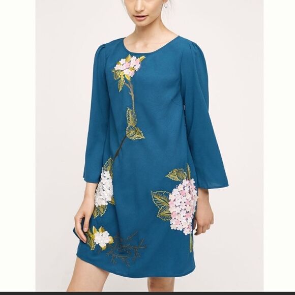 Anthropologie Varun Bahl Teal Hydrangea Swing Dress