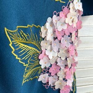 Stunning embroidery and embellishemts to create dimensional hydrangea blooms in white and pink on a deep, blue teal dress