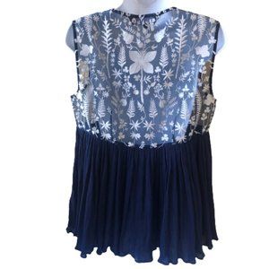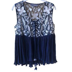 Anthropologie Varun & Nidhika Marlinna navy blue floral lace top with knife pleats. The upper portion is sheer lace with gorgeous embroidery in white. Peplum lower portion. Seven hook & eye front closure with six decorative ties. Wide straps.