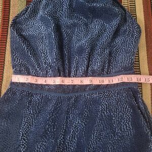 Anthropologie Velvet Nova Jumpsuit in Navy Blue Textured Polka-dot, Sleeveless, halter neckline, back neck tie and zip closure, Straight Leg, fully lined, nylon Viscose blend.